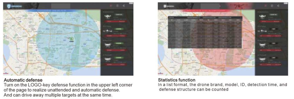 Għal drones intrużi, tista 'tagħżel: Waħda-Difiża awtomatika ewlenija: Wara li l-funzjoni ta' difiża tas-sistema tkun attivata, id-drone ta 'intrużjoni se jiġi difiż awtomatikament mis-sistema mingħajr persunal fuq xogħol; Intervent manwali: Tista 'tagħżel manwalment li tiddefendi kwalunkwe drone, u kif Id-difiża tal-Ħin, jew tinterrompi d-difiża, u tista' tagħżel li ssib il-pilota.
